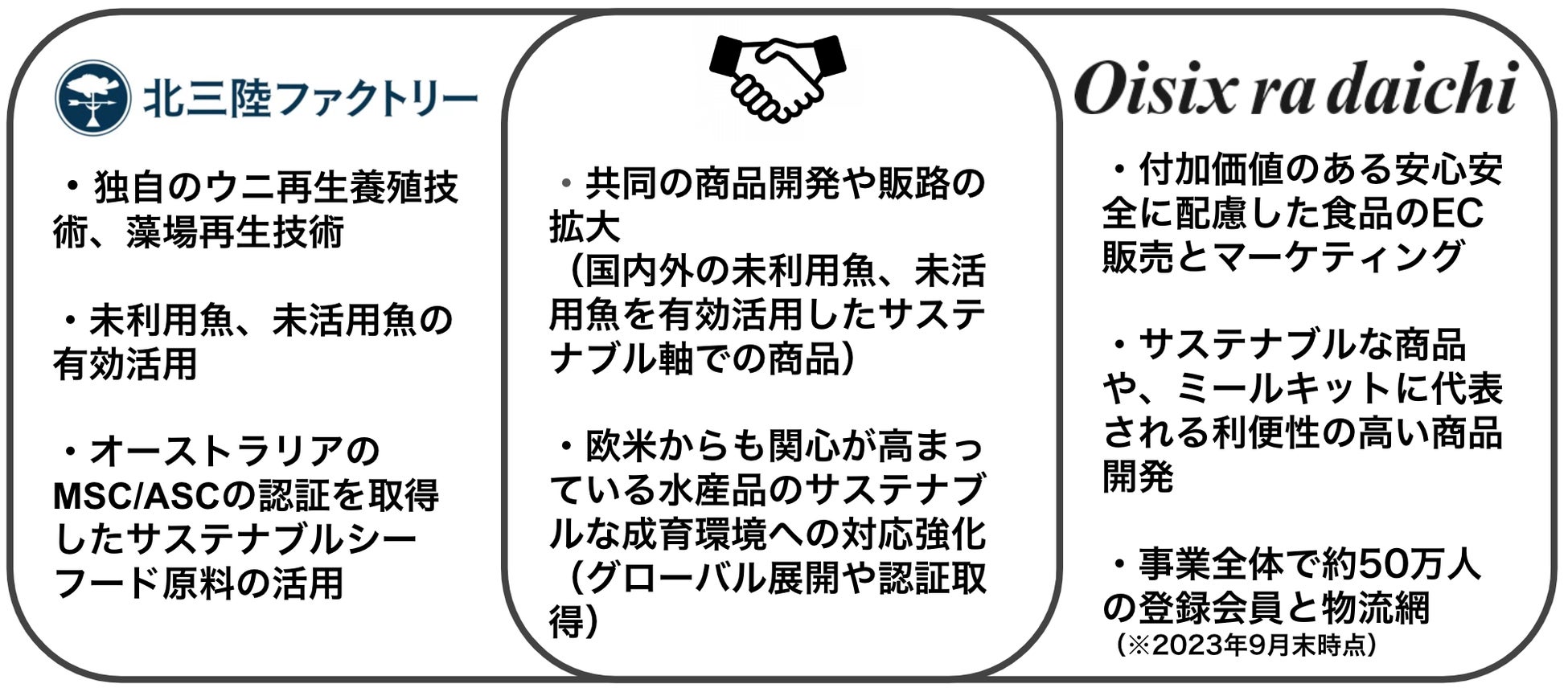当社が資本参加することで、ウニ再生養殖事業を中心としたサステナブルプロダクト領域での連携や、北三陸ファクトリーの技術と当社の商品開発・マーケティングとの協業、ASCやMSC等の認証を取得したサステナブルシーフードを活用した商品開発により両社にとってそれぞれの事業成長を見越した相乗効果が期待できます。
